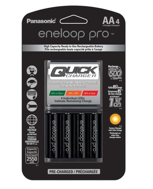O carregador rápido de bateria Panasonic é um carregador de bateria avançado e rápido que pode carregar até 4 baterias AA ou AAA em apenas 4 horas. Carrega individualmente cada bateria recarregável Eneloop Pro AA e AAA, resultando sempre em uma carga perfeita. Possui 4 slots independentes que permitem carregar baterias de diferentes tipos e tamanhos. Ele também inclui uma luz indicadora de status que mostra o progresso do carregamento. Desempenho duradouro, recarrega baterias recarregáveis Eneloop Pro AAA até 500 vezes. As baterias recarregáveis Eneloop Pro AAA são pré-carregadas na fábrica com energia solar e mantêm até 85% de carga após 1 ano (quando não estão em uso). Tempos de carga rápidos O carregador de bateria CC55 carregará uma bateria eneloop pro 4AA totalmente descarregada em aproximadamente 4 horas; eneloop pro 2AA ou 2AAA em até 2 horas.
