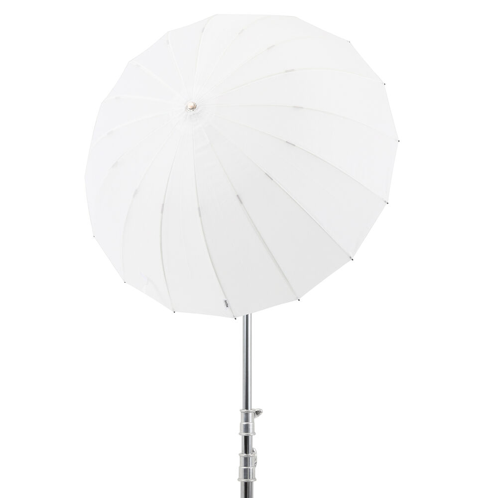 O guarda-chuva parabólico transparente de 34" da Godox é um modificador de luz exclusivo que combina os efeitos de um guarda-chuva e de uma softbox. O guarda-chuva cria uma luz suave e difusa, e o material transparente permite usá-lo como rebatedor ou como modificador de luz direta, semelhante a uma softbox.