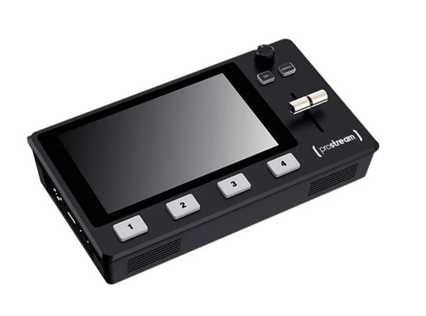 Switcher com tela full HD touch screen de 5.5 polegadas, com capacidade para controlar câmeras PTZ, preview de imagem em real time e USB 3.0 para uso em live streaming. O switcher também conta com T-Bar para transições e efeitos, com até 15 efeitos de transição, e modo Picture in Picture.
